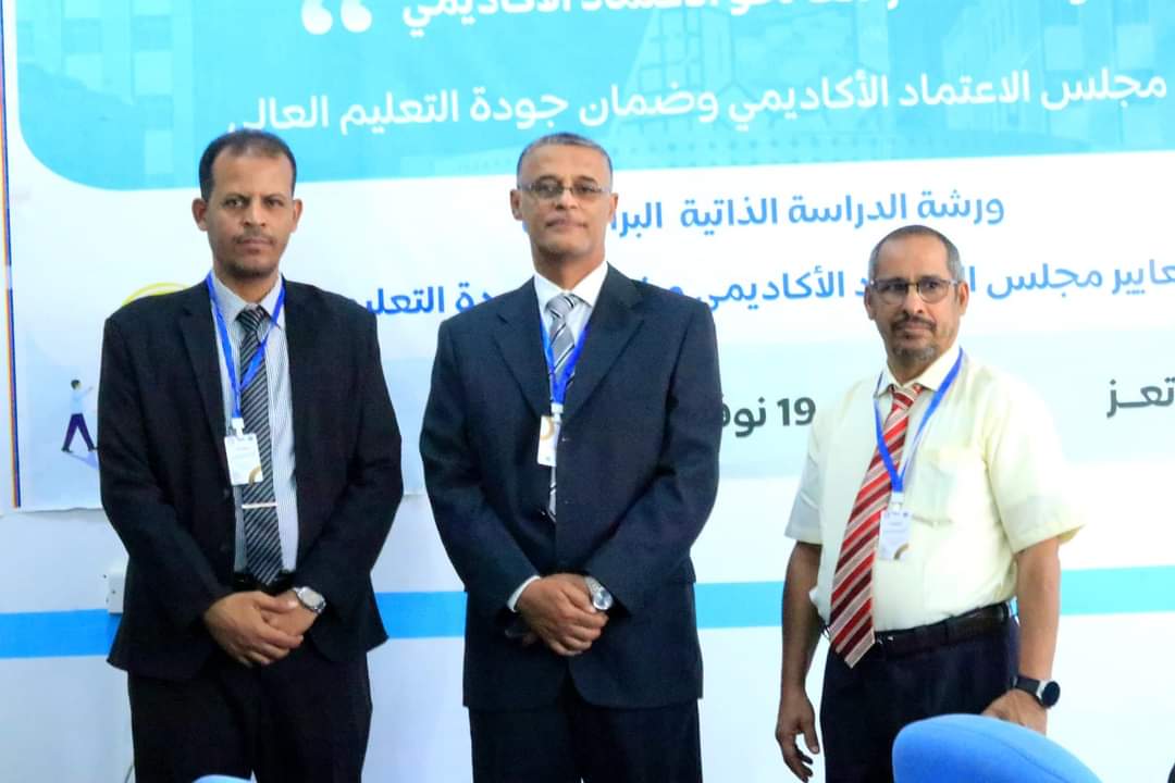 جامعة سيئون تشارك في ورشة الدراسة الذاتية البرامجية وفق معايير مجلس الإعتماد الأكاديمي وضمان جودة التعليم العالي بتعز.