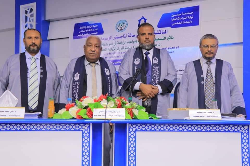كلية الزراعة والأغذية بجامعة سيئون تشهد حدثا تاريخيا بمناقشة أول رسالة ماجستير بعنوان تأثير التسميد بالبوتاسيوم ومواعيد الزراعة في نمو وإنتاج الخيار تحت ظروف الزراعة المحمية .