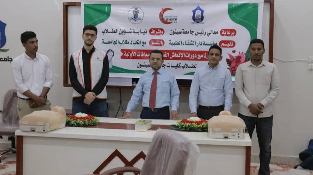 بإشراف نيابة شؤون الطلاب بجامعة سيئون مؤسسة دار الشفاء الطبية تقيم دورة تدريبية في الإنعاش القلبي والاسعافات الأولية للطلاب المهتمين بالنشاط الصحي في كلياتهم .