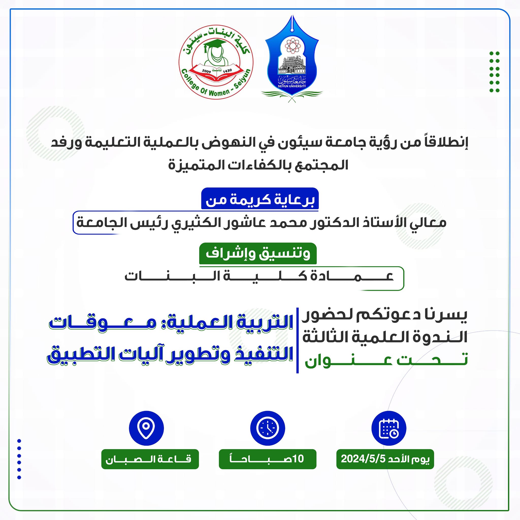بحضور رئيس الجامعة ونائب رئيس مجلس النواب كلية البنات تقيم الندوة العلمية الثالثة بعنوان التربية العملية معوقات التنفيذ وتطوير آليات التطبيق.